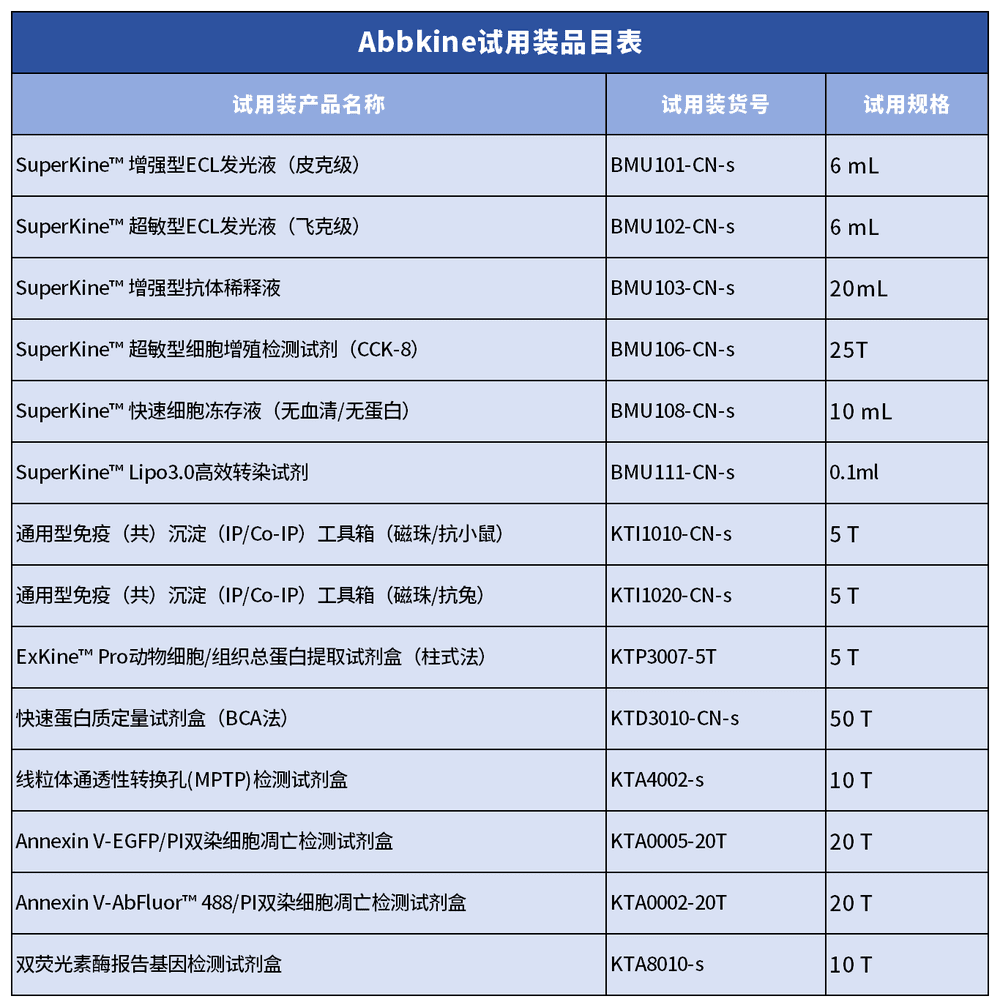 申领对象:欢迎生命科学类终端用户申领Abbkine的免费试用装。仅限于专业人员的科学研究用,非专业人员不得申领。