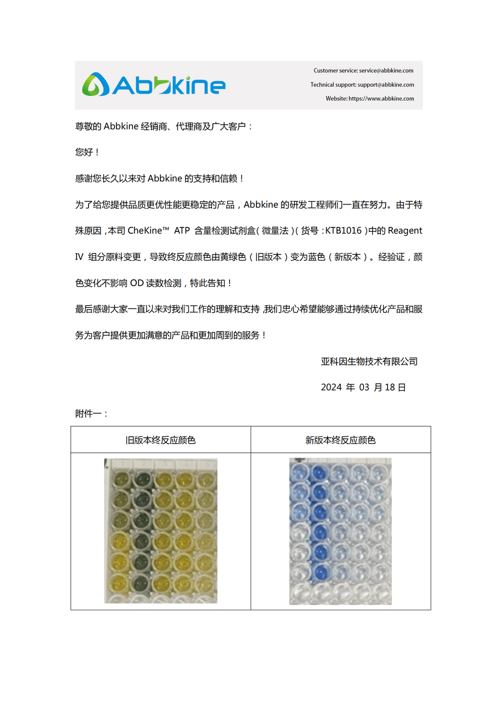 为了给您提供品质更优性能更稳定的产品,Abbkine 的研发工程师们一直在努力。由于特殊原因,本司 CheKine™ ATP 含量检测试剂盒(微量法)(货号:KTB1016)中的 Reagent IV 组分原料变更,导致终反应颜色由黄绿色(旧版本)变为蓝色(新版本)。经验证,颜色变化不影响 OD 读数检测,特此告知!