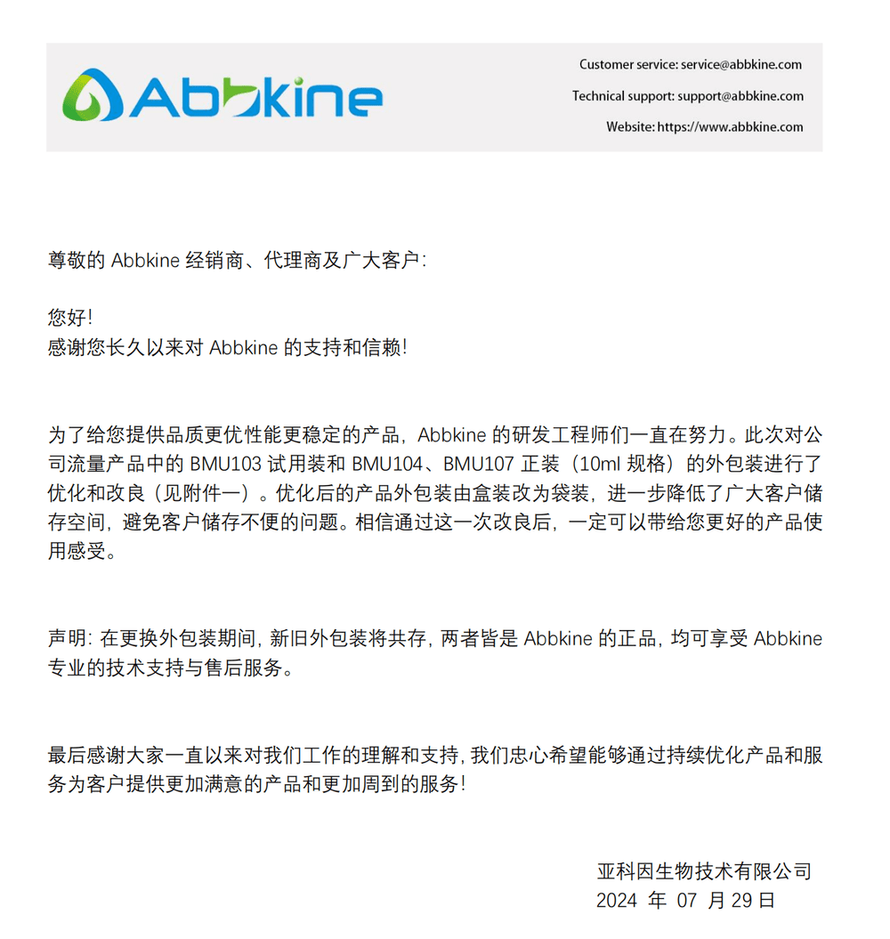 亚科因生物技术有限公司(Abbkine Biotechnology Co., Ltd)成立于2017年,总部位于中国武汉。公司致力于细胞科研检测及细胞治疗领域关键试剂的研发、生产和销售,成为全球细胞制药领域创新的关键推动者。公司主营业务包括细胞培养、扩增及储存试剂,细胞代谢、检测及分选试剂盒,细胞治疗用原料及细胞因子等产品及定制化服务。围绕生物试剂研发,亚科因生物已建立了稳定完善的两大关键技术平台:生化试剂配方和重组蛋白表达进化平台,为细胞科研检测及细胞治疗核心试剂的高通量、高效率研发生产提供保障。