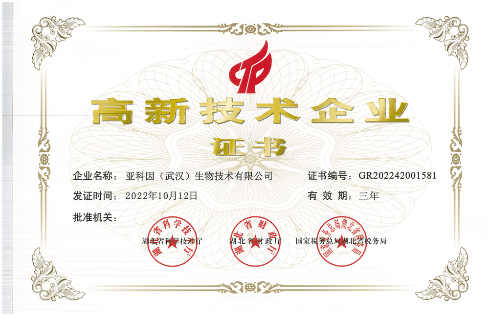 本次通过国家高新技术企业认定不仅是国家权威部门对我司的研发创新能力、核心自主知识产权和科技成果转化能力的充分肯定,也对提高我司科研水平、推进技术创新、人才创新、管理创新、提升企业核心竞争力、持续推动高质量发展具有重要意义。同时也证明亚科因在生命科学和药物研发领域具备了持续开发创新生物试剂产品更强的核心竞争力!继往开来,亚科因也将不负重望,持续坚持以科技创新为战略方针,扎实开展科技产品研发、科技成果转化、产学研合作等基础工作,不断提高科技管理水平,提供更多优质的产品,为亚科因高质量发展提供更强大的生命力和创造力!