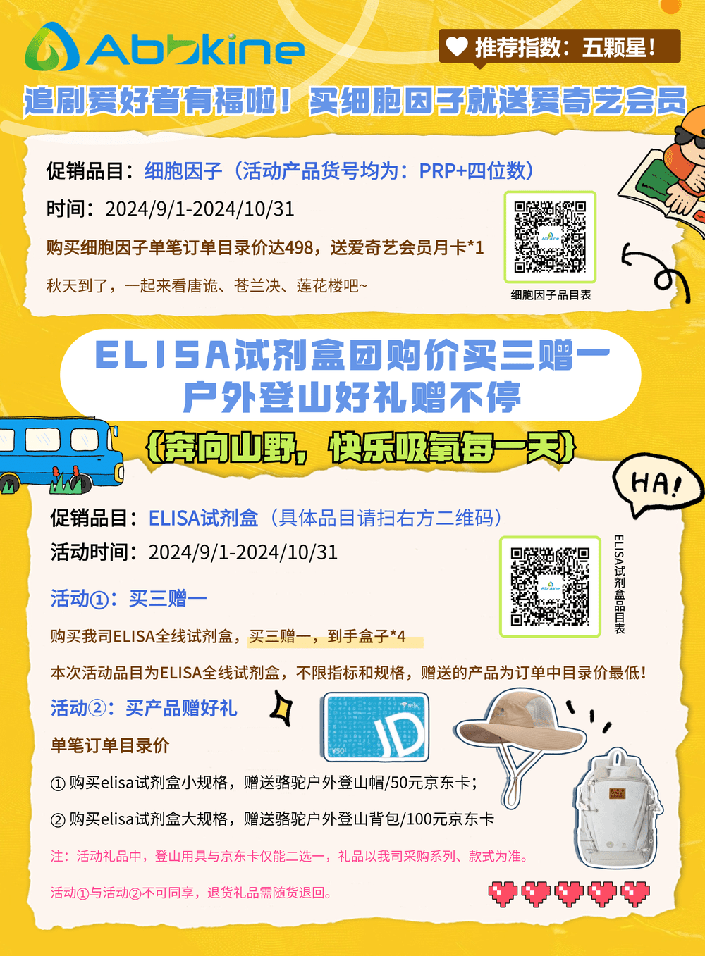 Hello开学季,福利嗨不停,亚科因生物助力生化试剂盒大放价,促销指标超200+!买就送赠送旅行手拿包、惠普猫爪U盘、200元京东卡等,买三赠一团购还有惊喜~