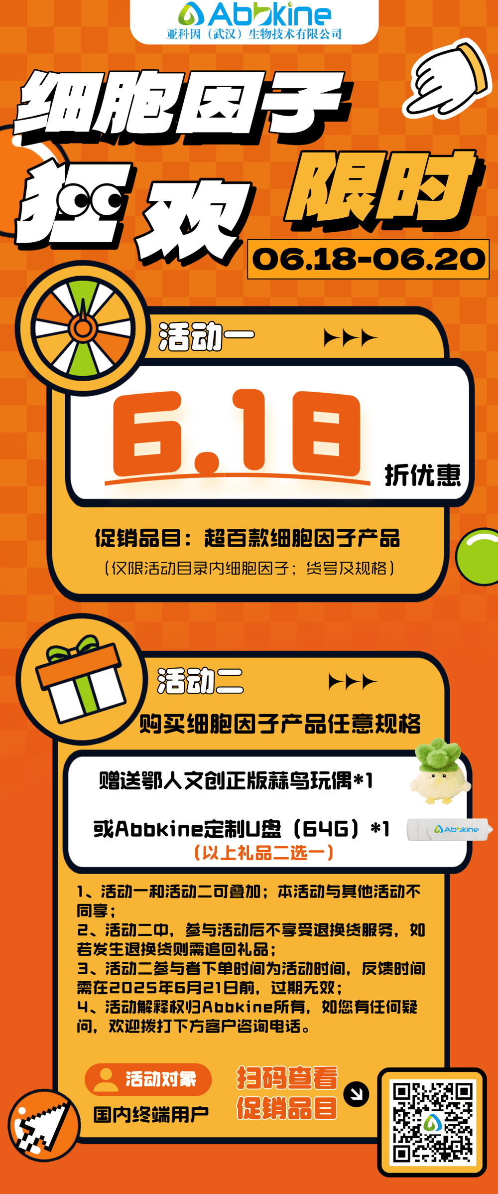 l活动二:购买细胞因子产品,购买任意规格,赠送鄂人文创正版蒜鸟玩偶或Abbkine定制U盘(64G)一个;1、活动一和活动二可叠加;本活动与其他活动不同享