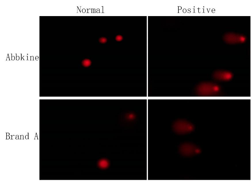图3. Abbkine彗星法DNA损伤分析试剂盒(3孔载玻片)检测Jurkat正常细胞和DNA损伤诱导阳性对照组的DNA损伤情况。Abbkine彗星检测试剂盒检测的荧光亮度和清晰度高于其他品牌。
