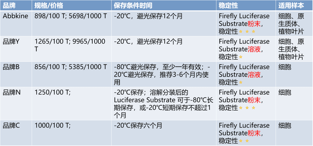对不同品牌荧光素酶报告基因检测试剂盒的稳定性和适用样本类型,经过对比发现Abbkine试剂盒适用样本广泛,稳定性高。