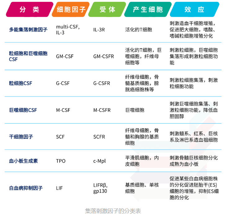 在进行造血细胞的体外研究中,发现一些细胞因子可刺激不同的造血干细胞在半固体培养基中形成细胞集落,这类因子被命名为集落刺激因子(CSF)。集落刺激因子 (CSFs) 是粒细胞和巨噬细胞的主要调节因子,最初被定义为造血细胞生长因子。根据其作用靶细胞CSF分为四种:粒细胞和巨噬细胞CSF (GM-CSF)、粒细胞CSF (G-CSF)、巨噬细胞CSF (M-CSF) 和多能集落刺激因子(multi-CSF, 通常称为IL-3)。CSFs 能刺激不同发育阶段的造血前体细胞的生长和分化,包括粒细胞、巨噬细胞、嗜酸性粒细胞和红细胞。