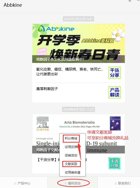 关注Abbkine微信公众号-进入主页-点击下方福利活动-文献奖励-提交文献发表信息进行申请。