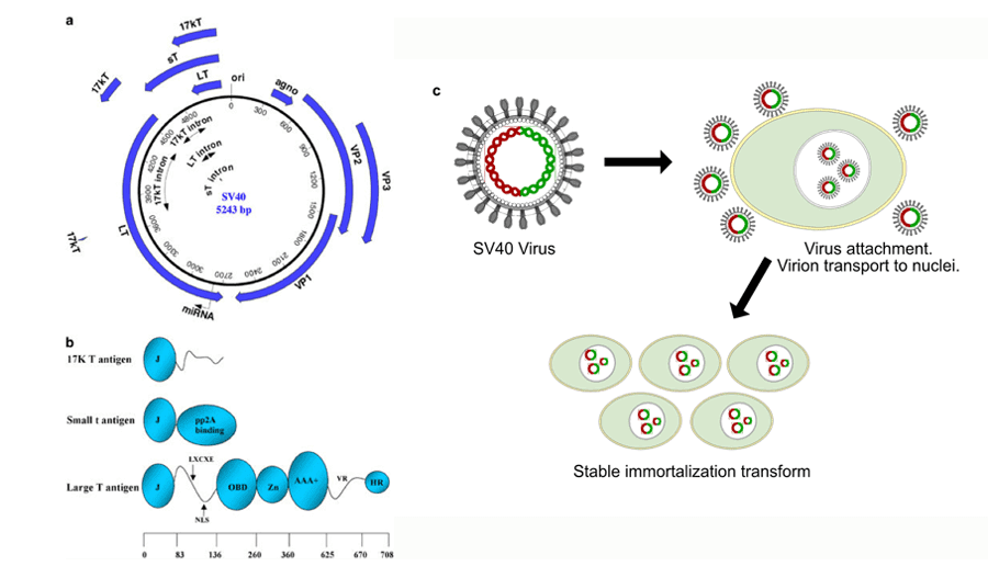 SV40大T抗原能使细胞进入永生化的增殖状态,通过将SV40大T抗原片段整合入靶细胞9的细胞核内,使其表达来构建永生化细胞系9,这是目前构建永生化细胞广泛使用的一种方式。