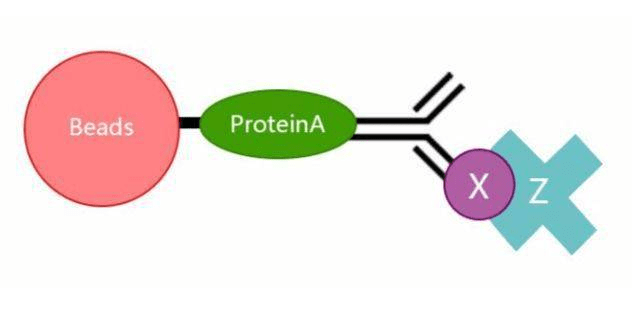 当细胞在非变性条件下被裂解时,完整细胞内存在的许多蛋白质-蛋白质相互作用被保留了下来,假如细胞内存在XZ蛋白复合物,用X (诱饵蛋白) 的抗体免疫沉淀X,那么与X在体内结合的蛋白质Z (靶蛋白) 也被沉淀下来。因此在细胞裂解液中加入X 的抗体沉淀蛋白 X,随后利用蛋白印迹 (western blot,WB) 检测沉淀中是否存在蛋白Z,如果存在,则说明细胞内存在XZ蛋白复合物,即蛋白XZ 存在相互作用。
