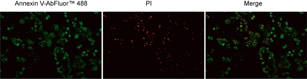 实验步骤一、细胞凋亡阳性诱导1. 对于待诱导凋亡的培养细胞,分别按照与细胞培养液的体积比1:1,000-1:3,000的比例把Apoptosis Inducer A或Apoptosis Inducer B加入到培养液中(也可将Apoptosis Inducer A和Apoptosis Inducer B同时加入培养液中)。2. 在4、8、12、16或24 h后观察细胞凋亡的情况。通常16-24 h后,在光学显微镜下可以看到明显的细胞形态的变化,此时可以用于细胞凋亡染色观察(不同细胞可按实际情况调整诱导浓度及诱导时间)。二、Annexin V-AbFluor™ 488/PI细胞凋亡检测A. 流式细胞仪分析1. 通过所需方法诱导细胞凋亡,同时培养无诱导的对照培养物。2. 4℃,300 g离心5 min收集1-2×105细胞,用冰预冷的PBS洗涤2次。注意:贴壁细胞使用胰酶(不含EDTA)消化后离心收集细胞,消化时间如果过长,易造成细胞膜结构损伤而出现细胞坏死的假阳性,所以需控制胰酶消化时间。3. 用500 µL 1×Annexin V Binding Buffer重悬细胞。4. 每500 µL细胞悬液中加入5 µL Annexin V-AbFluor™ 488和2 µL PI,轻柔混匀。5. 室温避光孵育15 min。6. 孵育结束后后置于冰上。染色后30 min内通过流式细胞仪分析细胞。使用491 nm和535 nm激发,517 nm(FITC通道)和617 nm(PE或PI通道)附近测量荧光。B. 荧光显微镜分析1. 对于悬浮细胞:1)按照步骤A.1到步骤A.6的流式细胞分析步骤。2)将步骤A.6的细胞悬浮置于玻片上,用盖玻片盖住细胞。尽快使用适当的滤镜通过荧光显微镜分析细胞(Annexin V- AbFluor™ 488可以使用FITC设置拍照,PI可以使用Cy®3或Texas Red®设置拍照)。2. 对于贴壁细胞,按照以下操作步骤:1)细胞接种于爬片或腔室载玻片上,培养细胞。2)通过所需方法诱导细胞凋亡,同时培养无诱导的对照培养物。3)除去培养基,用预热或者室温的PBS洗涤细胞2次。4)准备工作液:每100 µL 1×Annexin V Binding Buffer添加5 µL Annexin V- AbFluor™ 488和2 µL PI,轻柔混匀。5)在细胞中加入适量的工作液(确保工作液完全覆盖细胞),室温避光孵育15 min(可以在冰上孵育,以减缓凋亡过程,但孵育时间需延长到至少30 min)。6)用1×Annexin V Binding Buffer洗涤细胞2次。注意:此步不要使用PBS洗涤细胞。7)载玻片上添加一滴1×Annexin V Binding Buffer,然后将细胞爬片置于玻片上。对于细胞腔室载玻片上的细胞,添加足够的1×Annexin V Binding Buffer覆盖细胞。注意:也可使用抗荧光淬灭封片剂封片。8)使用适当的滤光片在荧光显微镜下分析细胞。