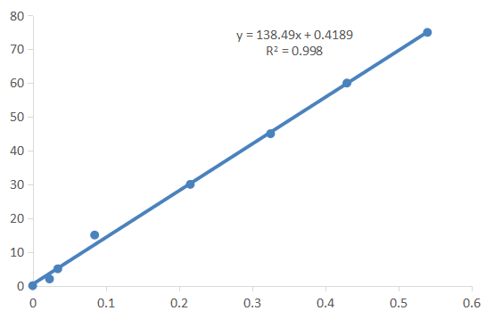 结果计算1.标准曲线绘制:以标准溶液Final formaldehyde concentration (µM)为y轴,ΔA标为x轴,绘制标准曲线(浓度为y轴更方便计算结果)。2.根据标曲计算样本产生的甲醛浓度 Formaldehyde (µM)=y×(0.17 mL÷0.02 mL)=8.5×y3.再计算CAT的酶活,1个酶活单位定义为:25℃环境下,每分钟产生1.0 nmol甲醛的酶的量 (1)按样本蛋白浓度计算CAT Activity=μM of Sample÷(20 min)÷Cpr×Sample dilution=0.425×y÷Cpr×Sample dilution (nmol/min/mg prot)(2)按液体体积计算CAT Activity=μM of Sample÷(20 min)×Sample dilution=0.425×y×Sample dilution (nmol/min/mL)(3)按样本鲜重计算CAT Activity=μM of Sample÷(20 min)÷W×Sample dilution=0.425×y÷W×Sample dilution (nmol/min/g)(4)细胞数量计算CAT Activity=μM of Sample÷(20 min)÷cells number×Sample dilution=0.425×y÷500×Sample dilution (nmol/min/104 cells)W:样本质量,g;Cpr:样本蛋白质浓度,mg/mL;500:细胞总数,500万。