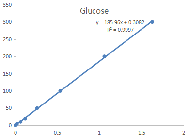 Figure 1. 葡萄糖检测的标准曲线,以下数据和曲线仅供参考,实验者需根据自己的实验建立标准曲线。