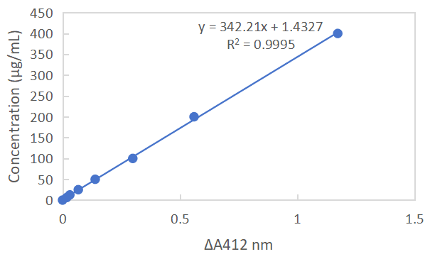 充分混匀,室温避光孵育2 min,记录412 nm处吸光度值A空、A标、A测。所有孔测定的吸光度A值减去空白孔的吸光度A空,即ΔA标=A标-A空,ΔA测=A测-A空。注意:实验之前建议选择2-3个预期差异大的样本做预实验。如果样本的ΔA测高于400 µg/mL标准品的ΔA标,将样本用去离子水进一步稀释,乘以最终的稀释倍数,如果ΔA测低于0.01,可增加样本量。