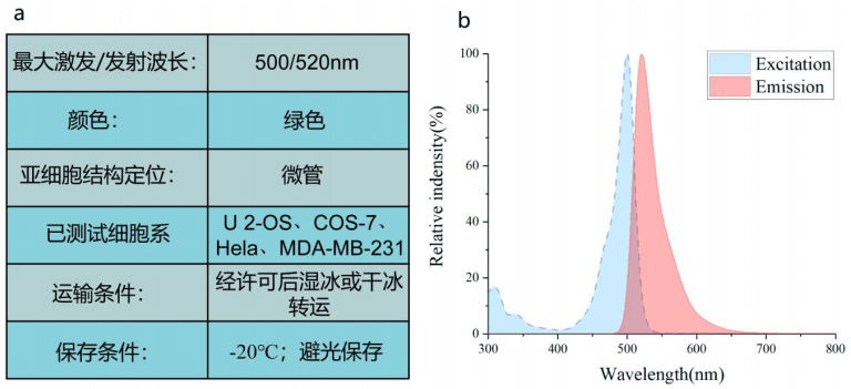 图1. Abbkine TraKine™ Pro 活细胞微管染色试剂盒(绿色荧光)Tubulin-Green探针信息