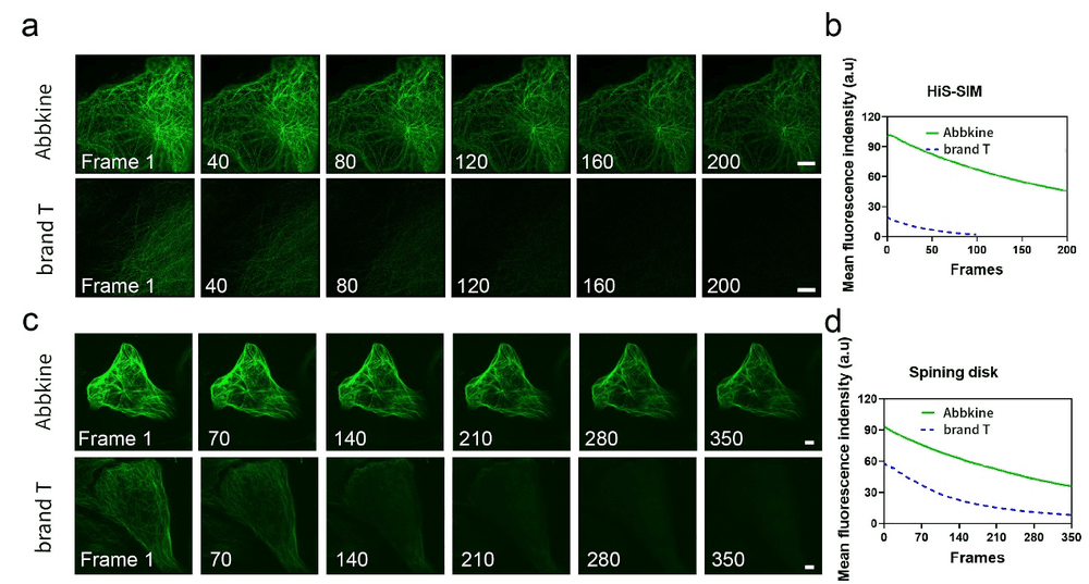 与市售Tubulin tracker Green的荧光性能相比:在同等拍摄参数的HiS-SIM 超分辨显微镜及Spining disk 共聚焦显微镜成像,可看出Tubulin-Green标记效果好、抗漂白能力强。如图2: