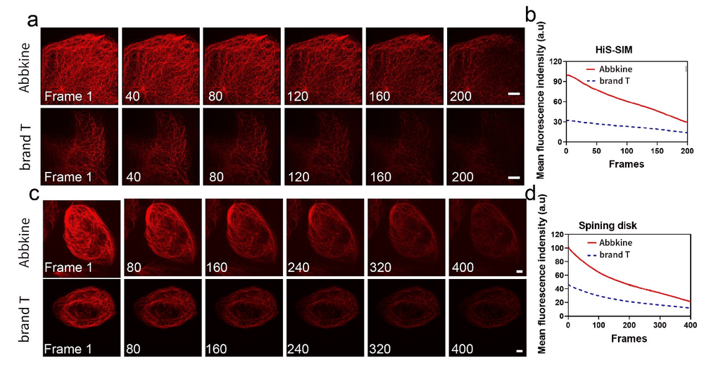 与市售的 Tubulin tracker Red 的荧光性能相比:在同等拍摄参数的 HiS-SIM 超分辨显微镜及Spining disk 共聚焦显微镜成像,可看出 Super Tubulin-Red 标记效果好、抗漂白能力强。如图5: