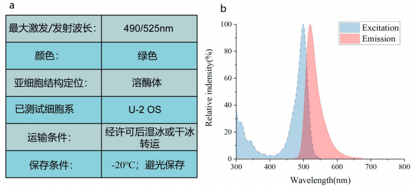 图6. Abbkine TraKine™ Pro活细胞溶酶体染色试剂盒(绿色荧光)Lyso-Green探针信息