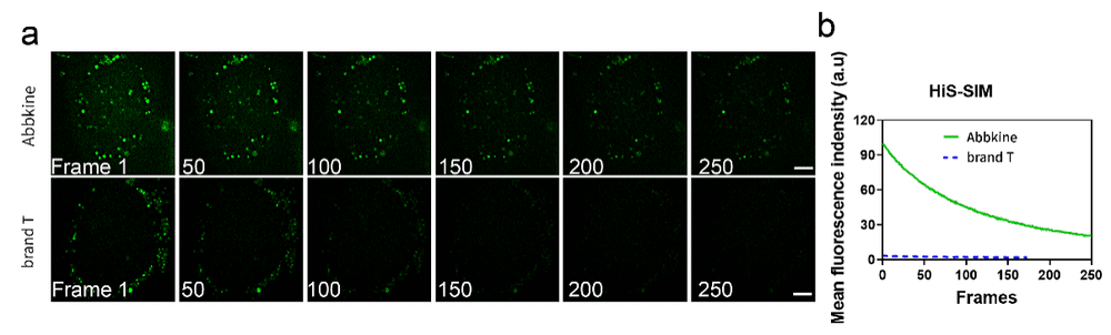 图7. Abbkine TraKine™ Pro活细胞溶酶体染色试剂盒(绿色荧光)与市售lyso tracker Green荧光性能对比