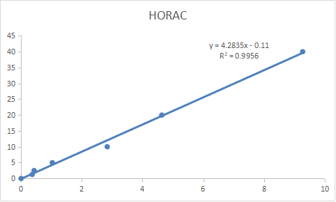 Figure 1. HORAC的标准曲线示例:取0.1 g植物组织加入1 mL 1×Assay Buffer进行匀浆研磨,取上清,之后按照测定步骤操作,用全黑96孔板测得:样本的AUC为9.199,空白的AUC为1.937,净AUC=AUC(样本)-AUC(空白)=9.199-1.937=7.262,标准曲线为y=4.2835x-0.11,Trolox浓度为30.997 µM,HORAC值(样本)=30.997 µM=30.997 µM TE=30.997 µmol TE/L。相关产品
