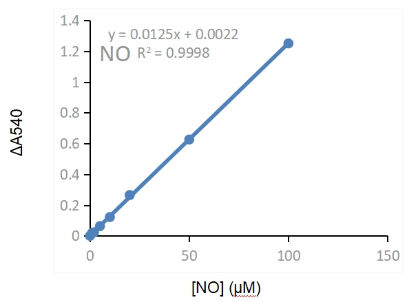 结果计算以标准液浓度为x轴,ΔAStandard为y轴,绘制标准曲线。将ΔASample带入方程得到x值(µM)即NO含量。换算:1 mg/dL NO相当于333 μM,0.001%或10 ppm。