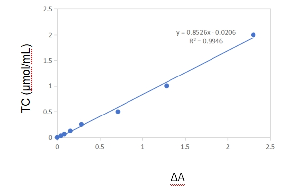 结果计算注意:我们为您提供的计算公式,包括推导过程计算公式和简洁计算公式。两者完全相等。建议以加粗的简洁计算公式为最终计算公式。1. 标准曲线的绘制以标准液浓度为y轴,ΔA标为x轴绘制标准曲线。将ΔA测代入标准曲线公式计算出y(μmol/mL)。2. 样本TC含量计算(1) 按样本质量计算TC含量(μmol/g 鲜重)=y÷(W÷V提取)×n=y÷W×n(2) 按蛋白浓度计算TC含量(μmol/mg prot)=y÷Cpr×n(3) 按细菌或细胞数量计算TC含量(μmol/104)=y÷(500÷V提取)×n=y÷500×n(4) 按液体体积计算TC含量(μmol/mL)=y×nW:样本质量,g;V提取,加入无水乙醇的体积,1 mL,n:样本的稀释倍数;Cpr:上清液蛋白质浓度,mg/mL;500:细菌或细胞总数,500万。