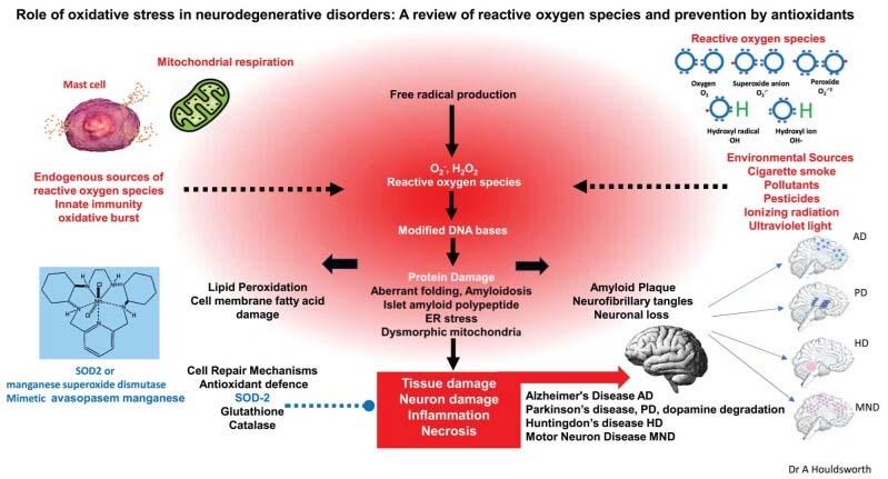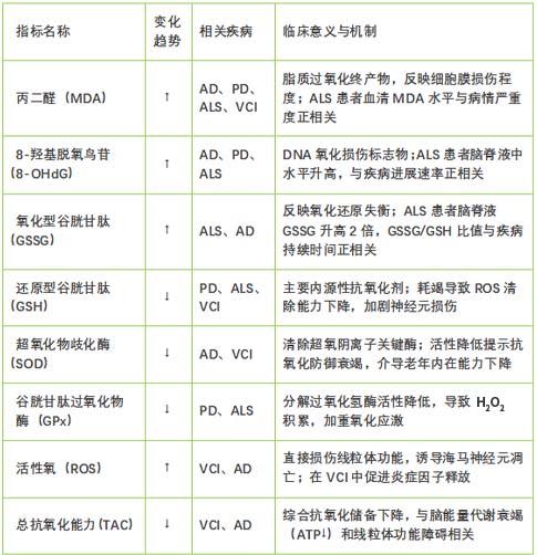 神经系统疾病包括多种疾病,包括阿尔茨海默病、运动神经元疾病和帕金森病,影响寿命和生活质量,其发病机制与氧化应激有关。在神经退行性疾病中,活性氧(ROS)过度产生与抗氧化防御系统衰竭形成恶性循环,导致蛋白质错误折叠(如Aβ、α-synuclein)、线粒体功能障碍(ATP↓、ΔΨm↓)及DNA损伤(8-OHdG↑),共同推动神经元死亡。