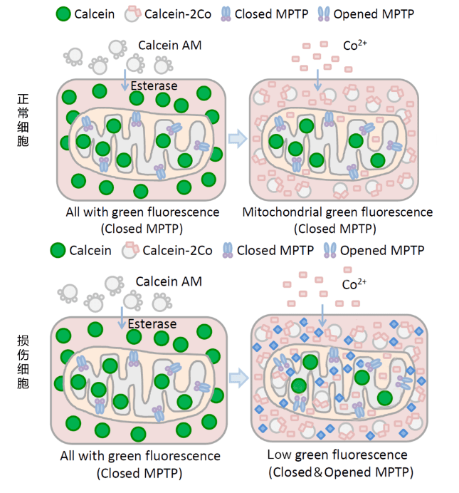 此时向该细胞中加入荧光探针——钙黄绿素乙酰甲酯(calcein acetoxymethyl ester, 即Calcein AM;一种非极性染料,可以对活细胞进行荧光染色。Calcein AM通过被动运输进入细胞内并在细胞质组分包括线粒体等中积累。Calcein AM在细胞内能被酯酶水解去除乙酰甲酯,生成没有膜通透性的极性荧光染料钙黄绿素(Calcein or Fluorexon),从而使Calcein滞留在细胞内以及线粒体中,使得细胞质包括线粒体等呈现强绿色荧光)。再加入CoCl2用于淬灭细胞质中Calcein的绿色荧光。正常情况下线粒体的MPTP是关闭的,CoCl2不能进入线粒体,因此在正常细胞中只是胞浆中的Calcein被淬灭;但是损伤的细胞MPTP有一定程度的开放,此时CoCl2便可以进入线粒体,因此在损伤细胞中除了胞浆中的所有Calcein被淬灭外,线粒体中的Calcein也有不同程度的淬灭。此时我们可以通过流式细胞仪检测Calcein的绿色荧光信号,通过比较荧光信号的强度判断MPTP的开放程度,进而推断线粒体的损伤程度。