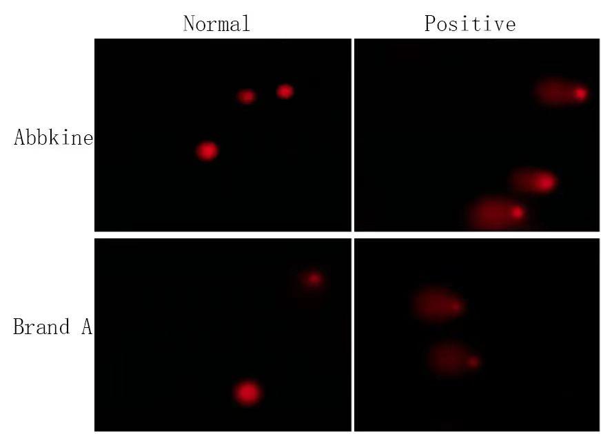 操作简便:无需用不同熔点琼脂糖繁琐铺胶,可快速、灵敏的检测细胞 DNA 损伤;可靠:相比于多层琼脂糖,样本不易脱落。实验效果展示Fig.用Abbkine 彗星试剂盒检测Jurkat细胞的DNA 损伤,并和A品牌进行比较。Abbkine 彗星试剂盒检测不仅步骤更简便,省时高效,且荧光较亮,样本不易脱落,可形成稳定鲜亮的结果。