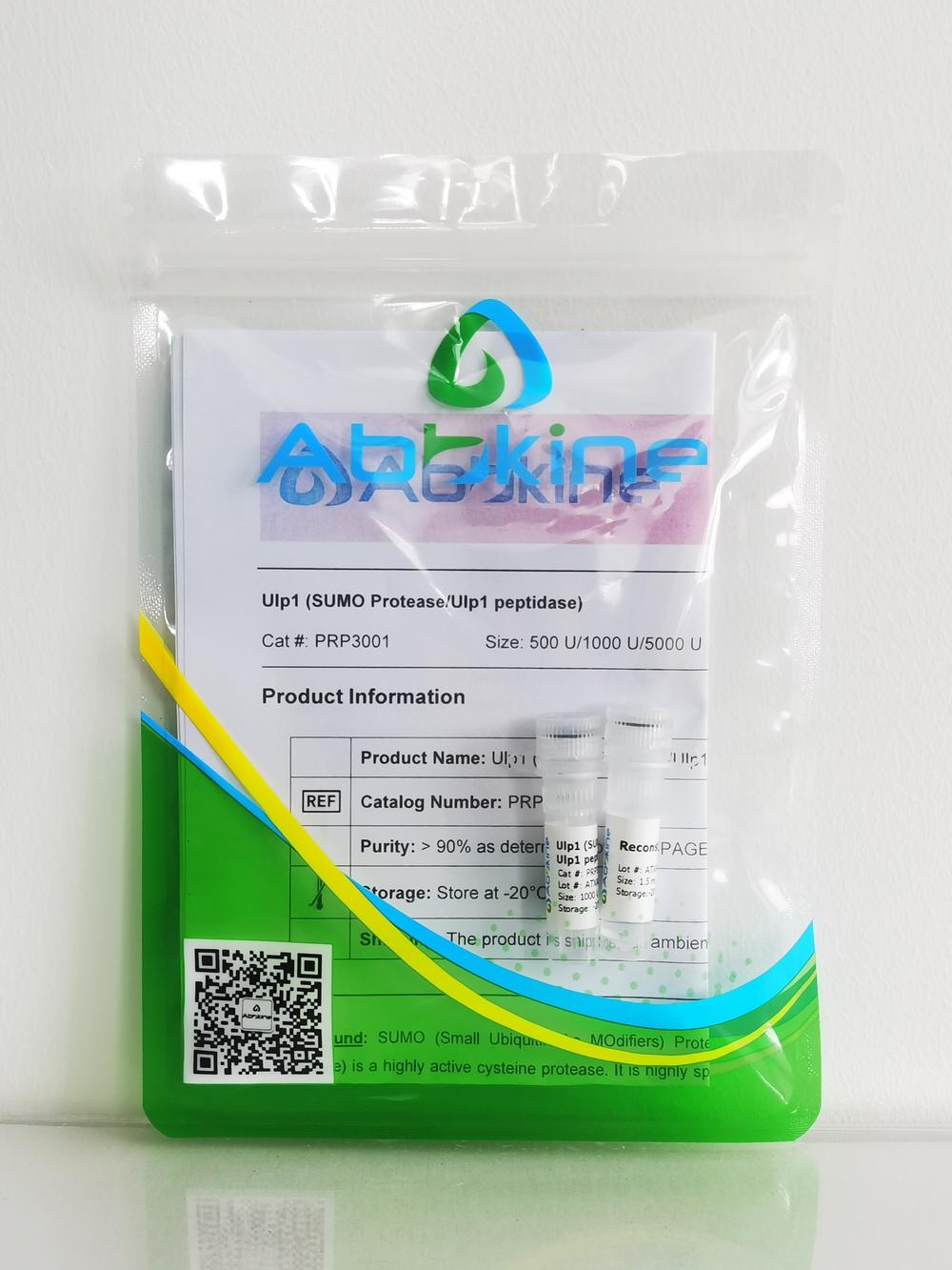 SUMO蛋白酶,又称Ulp1蛋白酶,是一种具有较高活性的半胱氨酸蛋白酶,来源于酵母编码的MIP1基因,Abbkine SUMO蛋白酶由E.coli表达并亲和纯化,纯度>90%。