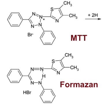 在MTT检测中,细胞是死是活主要看线粒体内的脱氢酶有没活性,那怎么知道他有没活性?这时蓝姑娘就牺牲自己,为脱氢酶验明正身。如果线粒体内的脱氢酶有活性,他就能将黄色的蓝姑娘(MTT)分解成兰紫色的水不溶性的甲瓒,并沉积在细胞中,死细胞无此功能。然后二甲基亚砜(DMSO)能溶解细胞中的甲瓒,用酶联免疫检测仪在490nm波长处测定其光吸收值,可间接反映活细胞数量。在一定细胞数范围内,MTT结晶形成的量与细胞数和细胞活力成正比。