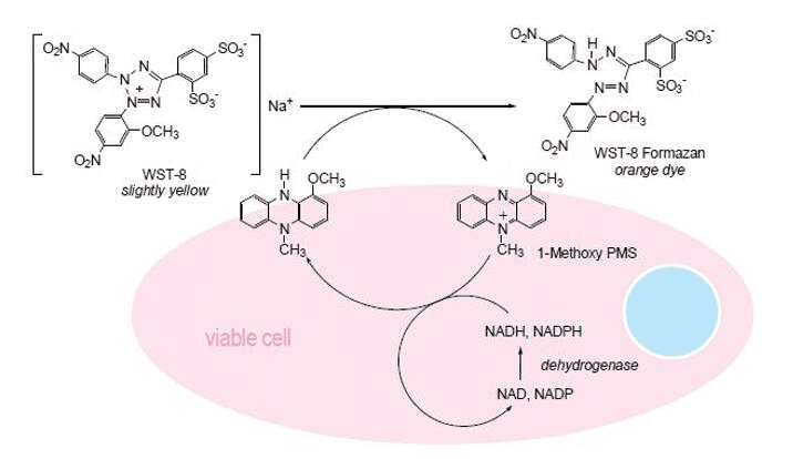 CCK-8就是MTT的升级版,CCK-8细胞活性检测试剂中含有WST-8——一种类似于MTT的化合物,在电子耦合试剂存在的情况下,可以为线粒体内的脱氢酶验明正身,在脱氢酶作用下,还原生成橙黄色的甲瓒产物。细胞增殖越多越快,则颜色越深;细胞毒性越大,则颜色越浅。对于同样的细胞,颜色的深浅和细胞数目呈线性关系。用酶联免疫检测仪在450nm波长处测定其光吸收值,可间接反映活细胞数量。