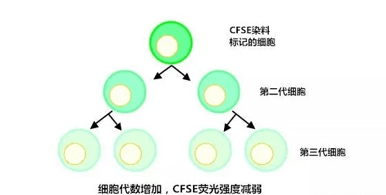 其检测法原理:CFSE进入细胞后,可以不可逆地与细胞内的氨基结合偶联到细胞蛋白质上。当细胞分裂时,CFSE标记荧光可平均分配至两个子代细胞中,因此其荧光强度是亲代细胞的。在一个增殖的细胞群中,各连续代细胞的荧光强度呈对递减,利用流式细胞仪在488nm激发光和荧光检测通道可对其进行分析。