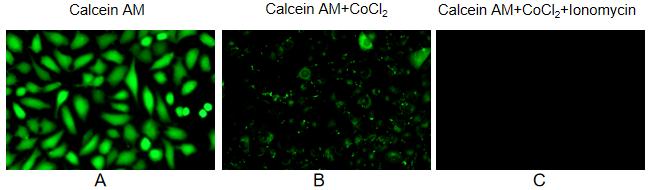 Fig. Calcein AM (1X)与L929细胞进行孵育,细胞质包括线粒体发出强绿色荧光(A);细胞与CoCl2 (1mM)孵育以后,细胞质内Calcein的绿色荧光被CoCl2淬灭,仅留下线粒体内的绿色荧光(B);使用Ionomycin (0.25μM)处理细胞,诱导细胞外的Ca2+大量进入细胞内,过多的Ca2+进入线粒体基质,导致MPTP的开放,使部分Calcein从线粒体内释放,同时使钴离子进入线粒体内并导致Calcein的绿色荧光淬灭(C)。