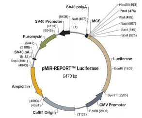 pMIR-REPORT载体:它用来插入miRNA靶序列,评估细胞内miRNA功能。该载体包含一个CMV启动子控制下的萤火虫荧光素酶报告基因。在荧光素酶基因的3'UTR区域包含一个多克隆位点,用于插入预测miRNA的结合靶序列或其他核苷酸序列。若荧光素酶活性下降,说明该段插入序列受到miRNA调节,这模仿了miRNA靶序列的作用方式。