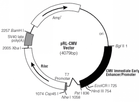 pRL系列载体(以pRL-CMV为例),pRL系列载体可在哺乳动物细胞中组成型地表达海肾荧光素酶。
