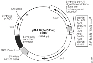 pGL4.20载体,pGL4.20载体含Luciferase荧光素酶报告基因,无启动子,用于研究目的启动子的功能,在荧光素酶基因的上游包含一个多克隆位点,用于插入启动子序列,若Luciferase荧光素酶活性上升,说明该段启动子受到转录因子的调控。